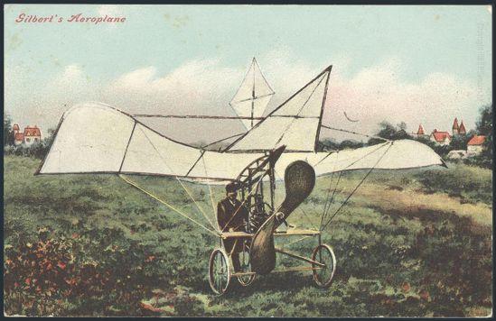 coloured postcard circa 1908 depicting OCTAVE GILBERT'S pioneer airplane. This was an impractical monoplane design. VF (Image)