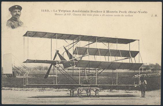 #162, Tied on b/w photo postcard circa 1909 depicting a pioneer BOCKOR TRIPLANE at Morris Park, New York. This is a very crude looking plane. Has the portrait of the pilot at top. Addr to Switzerland. F (Image)