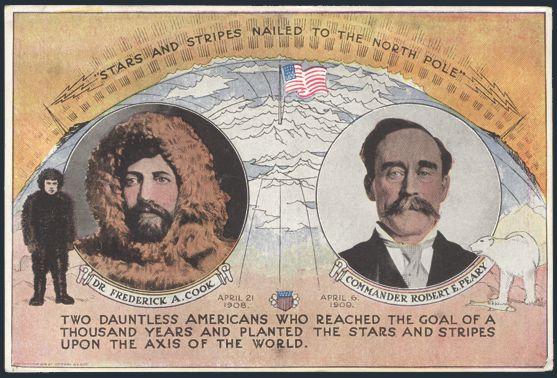 multi-coloured patriotic postcard circa 1909 depicting portraits of famous Arctic explorers FREDERICK COOK and ROBERT PEARY. Cook allegedly was the first man to reach the North Pole in 1908. VF (Image)