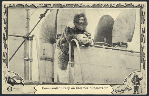 glossy postcard circa 1909 of COMMANDER ROBERT PEARY on the deck of the Steamer "Roosevelt". He made several expeditions to the Arctic in the 19th & early 20th Centuries. VF