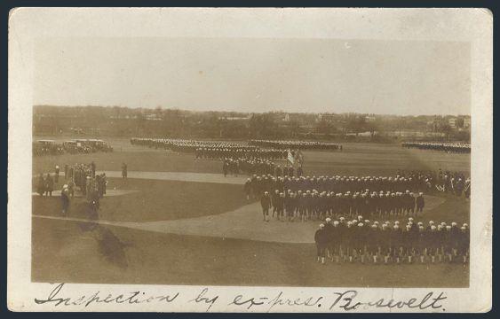 era b/w real photo postcard depicting former PRESIDENT TEDDY ROOSEVELT reviewing NAVAL SAILORS. F, minor crease, slight soiling (Image)
