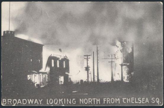 collection of 6 diff b/w postcards depicting scenes of the devastation caused by the GREAT CHELSEA MASSACHUSETTS FIRE OF 1908. The fire resulted in 15,000 people homeless. The postcards show the terrible aftermath of the fire. F, most unused (6) (Image)