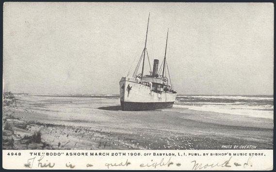 photo postcard depicting the stranded ship "BODO" which ran ashore off Babylon Long Island 20 Mar 1906. F (Image)