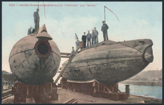 coloured "Mitchell" postcard circa 1900's depicting early United States Submarines "PORPOISE" and "SHARK". VF (Image)