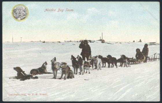 coloured postcard circa 1910 depicting an ALASKA DOG TEAM. This team carried a party of polar bear hunters on a 1,000 mile trip from Nome to the Far North. VF