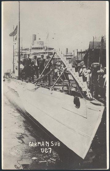 b/w real photo postcard of the GERMAN SUBMARINE UC7 on a visit to the USA. Shows naval officers on deck with an American flag flying in the background (Image)