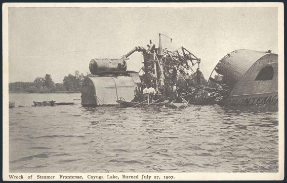 photo postcard of the WRECK OF THE STEAMSHIP "FRONTENAC" on Cayuga Lake, NY 27 July 1907. This was the largest steamer to operate on the lake and was destroyed by fire despite valiant efforts by the crew & others. Eight passengers died. VF (Image)