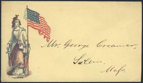patriotic cover addr to Salem Mass. Has Allegorical female figure with the American flag in colour. No postal markings. VF (Image)