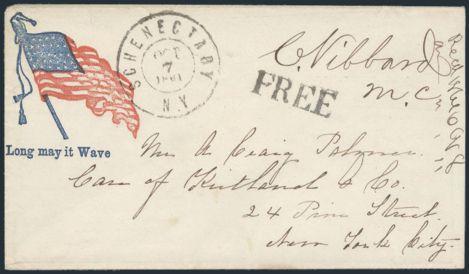 PATRIOTIC colour illustrated cover depicting Stars & Stripes "Long may it Wave". Has "FREE" h/s & signed "C. Nibband / M.C." to New York. Has Schenectady, NY 7 Oct 1861 2-ring cancel. VF (Image)