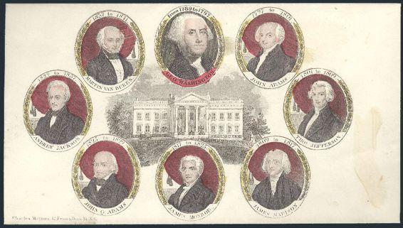 "Charles Magnus" illustrated patriotic envelope circa 1850's in Black / Maroon / Yellow with central scene of the White House. This is surrounded by portraits of 8 diff early American Presidents from 1789-1837, George Washington to Martin Van Buren.