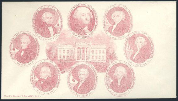 "Charles Magnus" illustrated patriotic envelope circa 1850's in ROSE with central scene of the White House. This is surrounded by portraits of 8 diff early American Presidents from 1789-1837, George Washington to Martin Van Buren. VF. Scarce (Image)