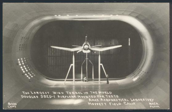 real photo postcard circa 1940's with a scene of a Douglas airplane being tested in the LARGEST WIND TUNNEL IN THE WORLD at the Ames Aeronautical Laboratory, Moffett Field, Calif. VF (Image)
