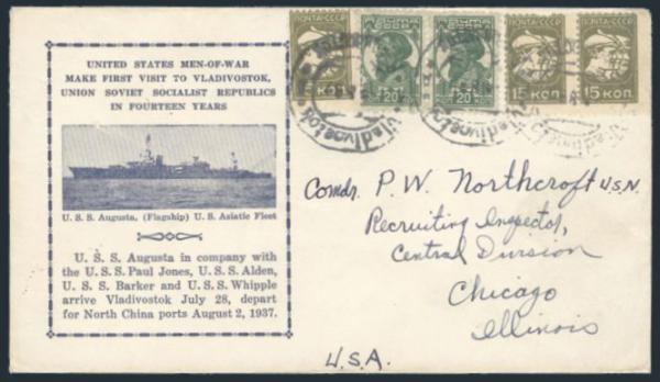 421 (3), 422 (2), Tied by Vladivostok 2 Aug 1937 CDS's on blue cach Naval Patriotic cover depicting U.S.S. Augusta, US Asiatic Fleet Flagship. This cover was mailed just before departure for Shanghai after fighting broke out with Japanese forces