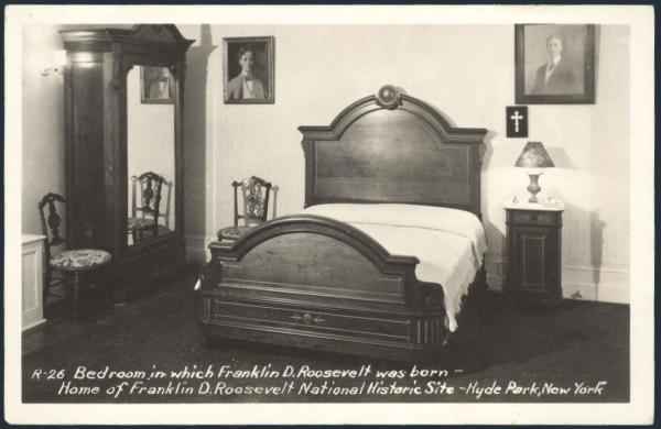 real photo postcard circa 1930's depicting the bedroom in which PRESIDENT FRANKLIN D. ROOSEVELT was born. VF (Image)