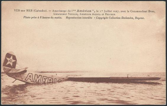 sepia postcard depicting the 1 July, 1927 water crash of Admiral Byrd's airplane "AMERICA". This crash occurred during a test flight for Byrd's Trans-Atlantic attempt. Printed in France. F (Image)
