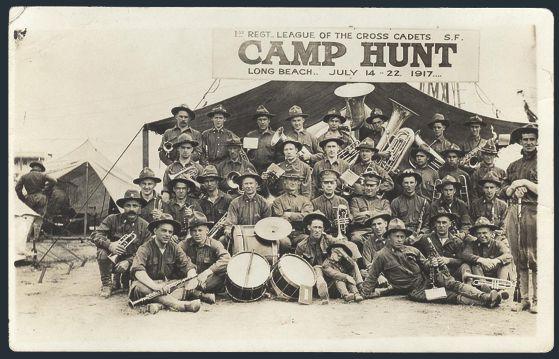 real photo WWI postcard 1917 showing a MUSICAL BAND at CAMP HUNT in Long Beach California. F (Image)
