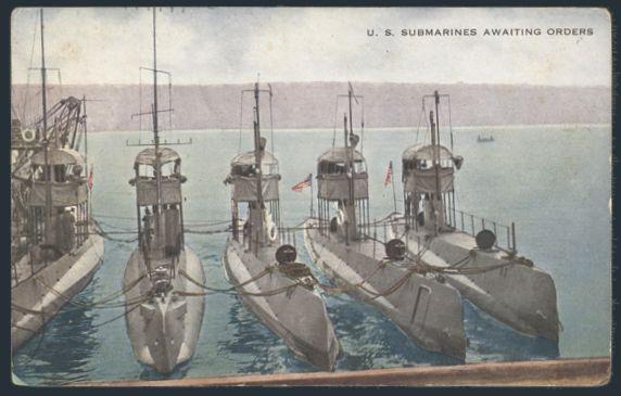 coloured postcard circa 1920's depicting a group of American SUBMARINES. F (Image)