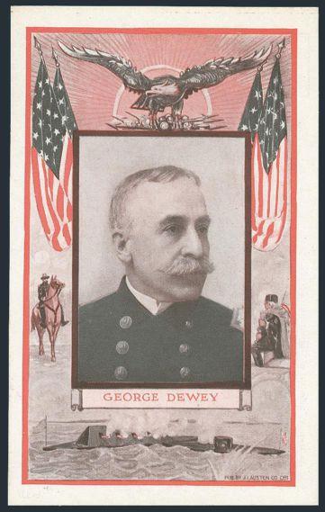 coloured Patriotic postcard circa 1920's-30's depicting ADMIRAL GEORGE DEWEY. He is best known for his 1898 victory at the Battle of Manila Bay during the Spanish American War. He is the only person in USA history to have attained the rank of Admiral