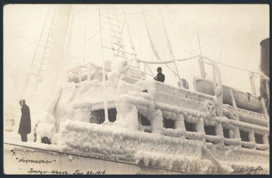 unused b/w real photo postcards 1916 depicting the ship "SS NORTHWESTERN" covered in ice following a storm off the Alaskan coast at Juneau. VF. Scarce (2) (Image)