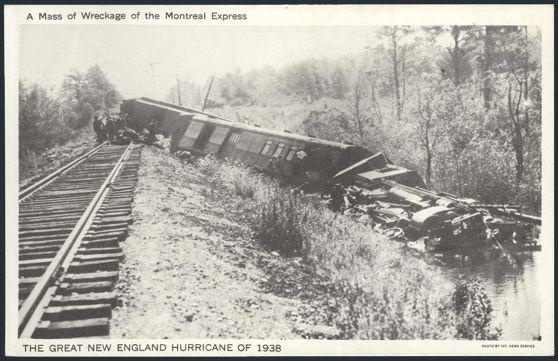 photo postcard depicting the TRAIN WRECK of the Montreal Express following THE GREAT NEW ENGLAND HURRICANE OF 1938. The Hurricane did hundreds of millions of dollars in damage & was one of the deadliest & destructive to ever strike the USA. VF (Image)