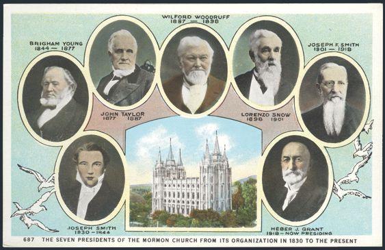 multi-coloured postcard 1930 depicting the SEVEN PRESIDENTS OF THE MORMON CHURCH from 1830-1930. VF (Image)