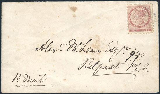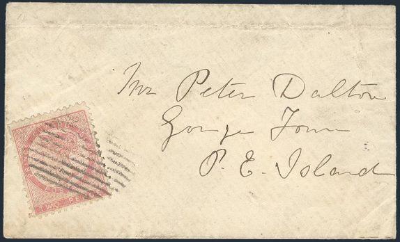 4513 1a image1a, Deep Rose tied by a neat grid cancel on 1863 cover to Belfast, PEI. On reverse has Prince Edward Island 13 June, 1863 cancel. F, some minor soiling. A NICE COVER IN ABOVE AVERAGE CONDITION. Cat $750 (Image) Estimate 600.00+ $Cdn