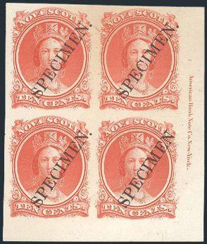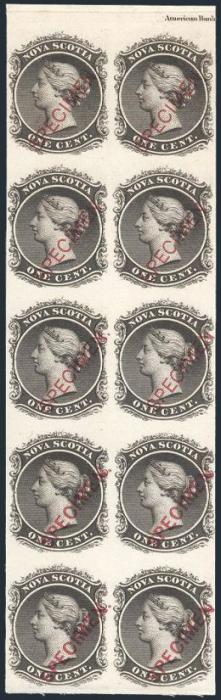 4508 8Pii, 8Piii image8Pii, 8Piii, Lovely Plate Proof vertical block of 10 on card. Shows two types of the diagonal SPECIMEN overprints with TYPE B (6) and TYPE C (4). Also has a portion of the imprint at top. VF (Image) Cat 500.00