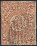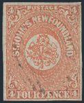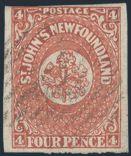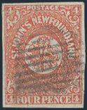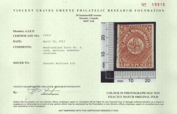 4528 4 image4, Four Pence Scarlet Vermilion with four margins. VF, strong colour, neat grid cancel, tiny tear, light horiz crease. Has 2024 Greene Foundation Certificate. A NICE LOOKING EXAMPLE OF THIS SCARCE STAMP (Image) (View Certificate)
