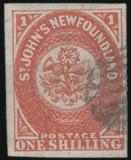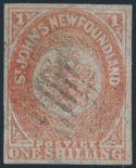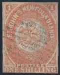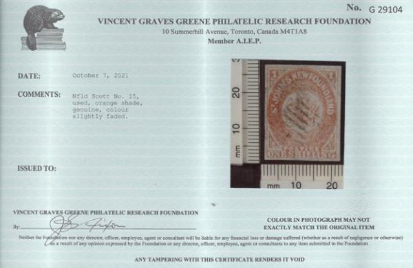 4543 15 image15, Scarce used One Shilling Orange, four full margins, lightly cancelled. VF, a trifle faded as often found on this issue. Has 2021 Greene Foundation Certificate. ONE OF THE RAREST STAMPS OF NEWFOUNDLAND (Image) (View Certificate)