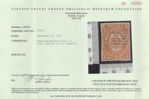 4541 13 image13, Six Pence Orange. VF, four full margins, neatly cancelled. A beauty! Has 2012 Greene Foundation Certificate (Image) (View Certificate)