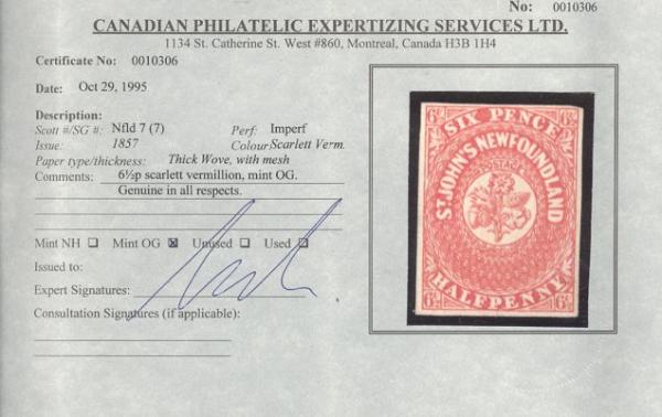 4529 7 image7, Scarce mint 6½ Pence Scarlet Vermilion, exceptional fresh colour, four margins (a bit close at top). VF. Has 1995 CPES Certificate stating Genuine OG but we think this is RG (Image) (View Certificate)