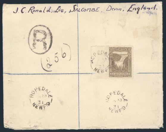 single tied by Hopedale 28 Jy, 1931 split-ring cancels on Reg'd cover to Salcombe, England (rec b/s's). F. SCARCE SINGLE FRANKING OF THE 30¢ GRAND FALLS (Image)