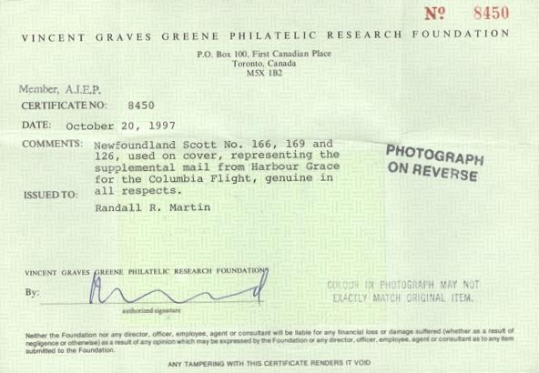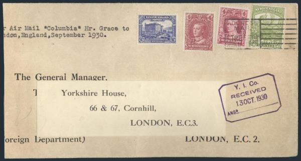 150, 166, Tied on "AIRSHIP COLUMBIA" Harbour Grace to London 9 Oct 1930 Flight cover. F-VF, reduced at left (AAMC #NFF-35c - $800) (Image)