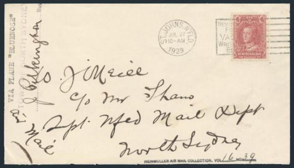 by St John's 27 July, 1929 slogan cancel on a "BLUENOSE" Flight cover to North Sydney NS (rec b/s). Has been signed by the Mayor of North Sydney and with Heinmuller Air Mail Collection h/s. F (AAMC #FF-32) (Image)