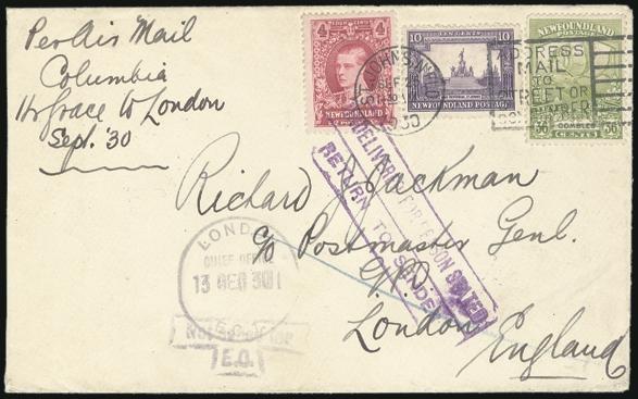 169, Tied by St. John's 25 Sept 1930 slogan cancel on "COLUMBIA" SUPPLEMENTARY MAIL Flight cover from Harbour Grace 9 Oct 1930 to London England. Has London 13 Dec 1930 rec cancels on front and reverse along with Return To Sender handstamps. VF.