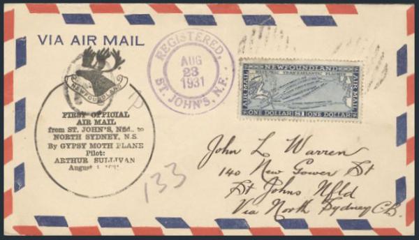 tied on Reg'd cach FFC St John's 23 Aug, 1931 to North Sydney NS (rec b/s). F (Image)