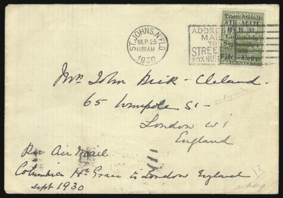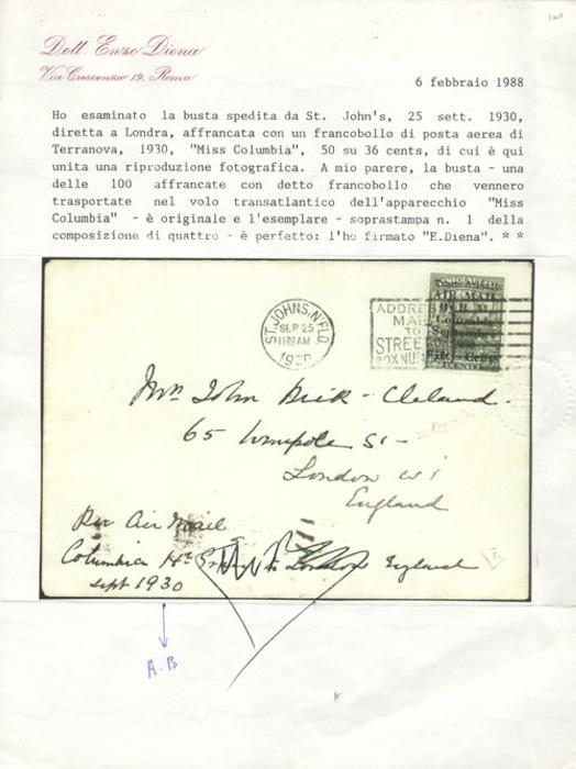 centred COLUMBIA airmail stamp tied by St. John's Sep 25, 1930 slogan cancel on cover flown from Harbour Grace (b/s) to London, England. F-VF. Has been signed by Raybaudi and Enzo Diena and has 1988 Diena Certificate. A SCARCE COVER (Image) (View Certificate)