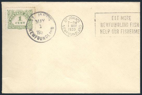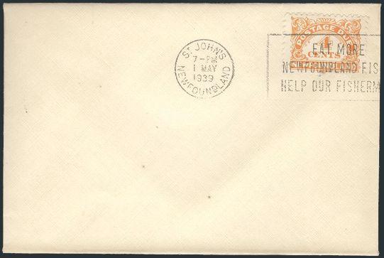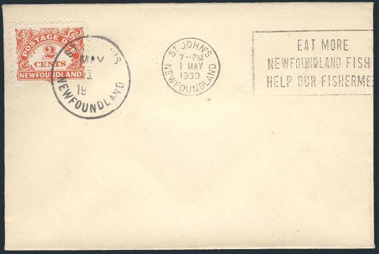 St. John's 1 May 1939 Eat More / Newfoundland Fish / Help Our Fisherman slogan FIRST DAY CANCEL on unaddr FDC. VF. Scarce (Image)