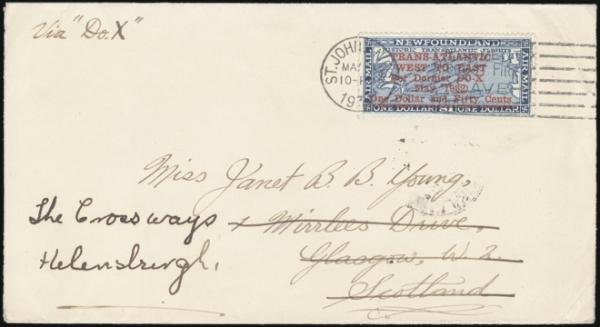$1.50 DO-X airmail tied by St. John's 23 May 1932 on airmail cover to Glasgow Scotland (rec b/s 26 My 1932) & redirected. F, edge creasing in cover not affecting the stamp