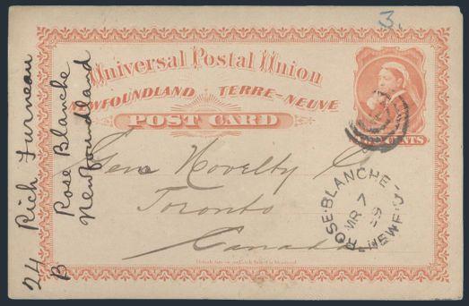 4735 P4 imageP4, QV 2¢ Postal Stationery card with VF split-ring cancel ROSE BLANCHE, NEWF'D 7 Mr, 1899, addr to Toronto. Scarce outport cancel. F (Image) Estimate 60.00+ $Cdn