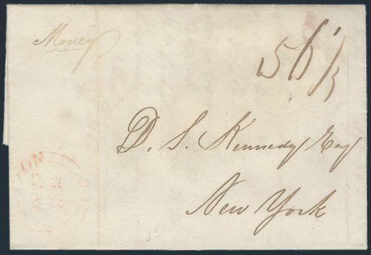 4748   imageStampless Cross Border "Money" cover with red Kingston UC 15 June 1843 2-ring cancel addr to New York. Has interesting "56.1/3" m/s triple rate. Large red wax seal on reverse. F-VF (Image) Estimate 75.00+ $Cdn