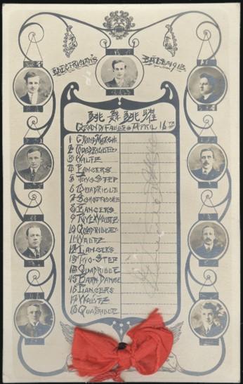4738   imageUnused b/w novelty postcard issued for the ELECTRICIANS BALL 16 Ap 1913 in Grand Falls. The postcard is in the form of a Dance Card with Chinese Lanterns & Chinese script. Has names of the dances, portraits of men & spaces for names. Still has original ribbon & pencil attached. F. VERY RARE (Image) Estimate 200.00+ $Cdn