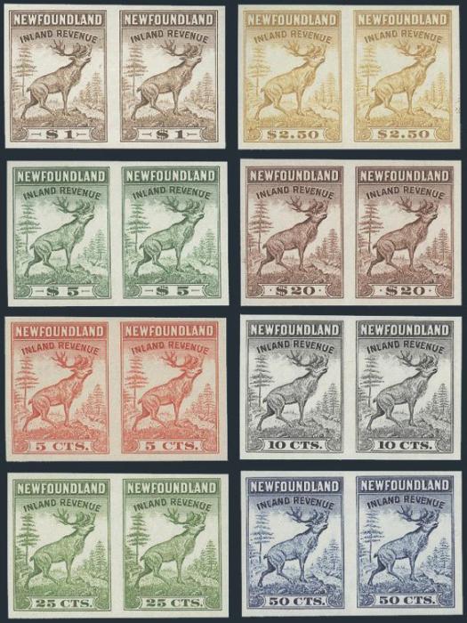 4728 NFR46-53A imageNFR46-53A, Complete set of IMPERFORATE PAIRS of the CARIBOU REVENUES from 5¢-$20. Fresh rich colours, VF, NH (NFR52, couple bends). A RARE SET WITH ONLY ONE SHEET OF 50 PRINTED FOR EACH VALUE (Image) Cat 3,750.00