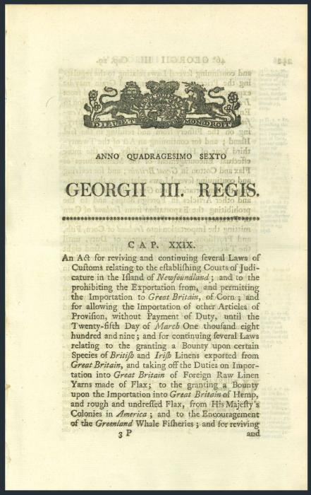 4736   imageScarce 1806 Printed Official Circular (7.25 x 11.9 inches) dealing with the laws & customs acts of Newfoundland. Printed on 3 double-sided pages. A fascinating insight into the laws & commerce during the reign of KGIII. F (Image) Estimate 100.00+ $Cdn