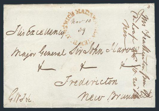 4747   imageStampless cover used from Madawasika NB, 13 Nov 1839 (date in m/s) to Fredericton NB. Addr to HIS EXCELLENCY MAJ GENERAL SIR JOHN HARVEY who was Lieut. Governor of New Brunswick at the time (earlier Gen. Harvey had also served as Lieut Governor of PEI and later held that position in Nova Scotia). Harvey had a distinguished military career in the Br. Empire. He took part in victories in the War of 1812 at Stoney Creek & Battle of Crysler's Farm in Ontario. F. Neat wax seal on back. A NICE HISTORICAL COVER (Image) Estimate 200.00+ $Cdn