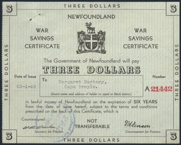 4741   imageNEWFOUNDLAND WAR SAVINGS $3 CERTIFICATE dated 20 Jan 1942. Has blue Newf'd Savings Bank Paid h/s. VF, centre fold (Image) Estimate 125.00+ $Cdn
