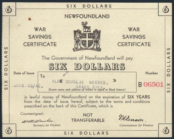 4742   imageNEWFOUNDLAND WAR SAVINGS $6 CERTIFICATE dated 13 June 1942. F, centre fold (Image) Estimate 175.00+ $Cdn