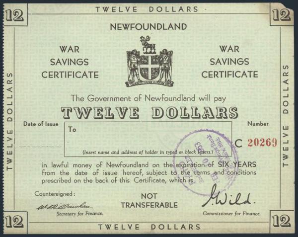 4743   imageNEWFOUNDLAND WAR SAVINGS $12 CERTIFICATE. Has violet Newf'd Savings Bank St. John's Paid h/s dated 10 Feb, 1953. F, one small corner stain/nick (Image) Estimate 200.00+ $Cdn