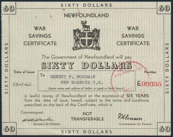 4744   imageNEWFOUNDLAND WAR SAVINGS $60 CERTIFICATE dated 29 July, 1942. Has purple Newf'd Savings Bank Paid h/s. F, centre fold. Scarce (Image) Estimate 250.00+ $Cdn