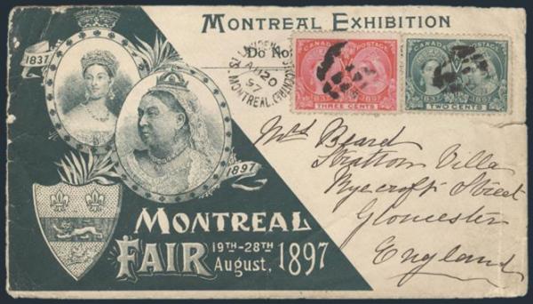 4799 52-3 image52-3, Cork cancels & tied by St Lawrence St (Centre) Montreal 20 Aug, 1897 on gorgeous illustrated advertising cover for the 1897 MONTREAL FAIR & EXHIBITION. Addr to Gloucester England (rec b/s 28 Aug '97). The stamps pay the 5¢ UPU rate to England. F, some edge flaws. A SPECTACULAR LOOKING COVER! (Image) Estimate 650.00+ $Cdn